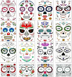 16 Feuilles Autocollant de Tatouage Visage Halloween Kit de Tatouage Visage Temporaire Halloween Journée des Roses Rouges de Tatouage Temporaire Crâne de Sucre Mort pour Mascarade d’Halloween